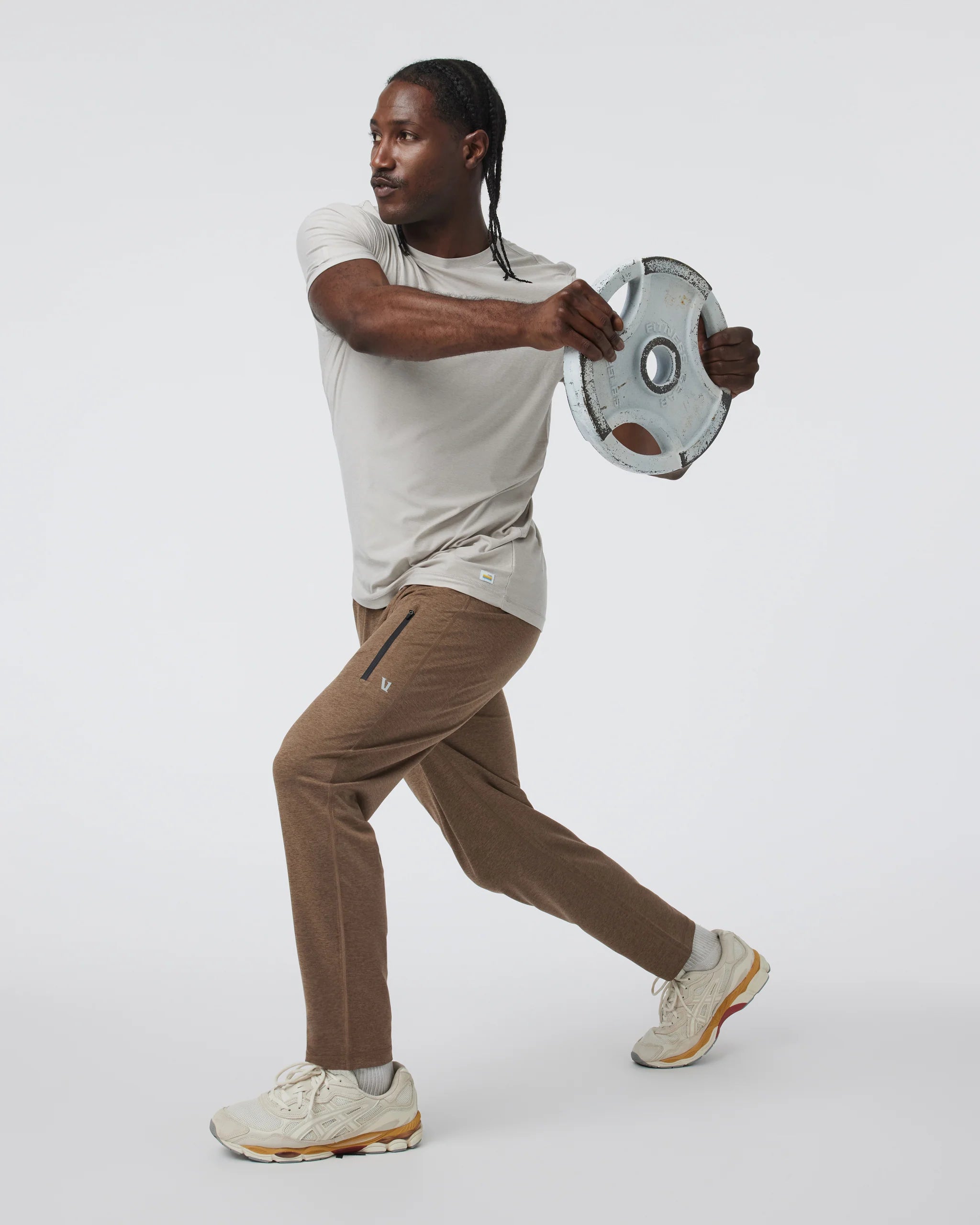 The loved Sunday fabric now in a tailored track pant silhouette. We revamped the style to have the loved thigh zip pocket while removing the zips at the bottom hem. We did this to give the customer a new silhouette in the Sunday family without the constraint of the gusset at the bottom hem zip.